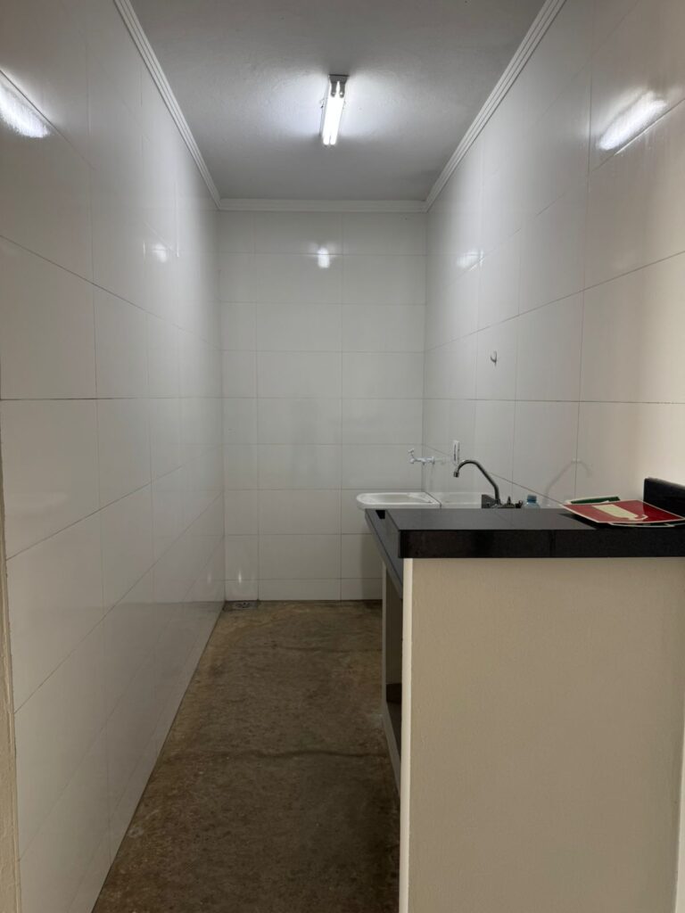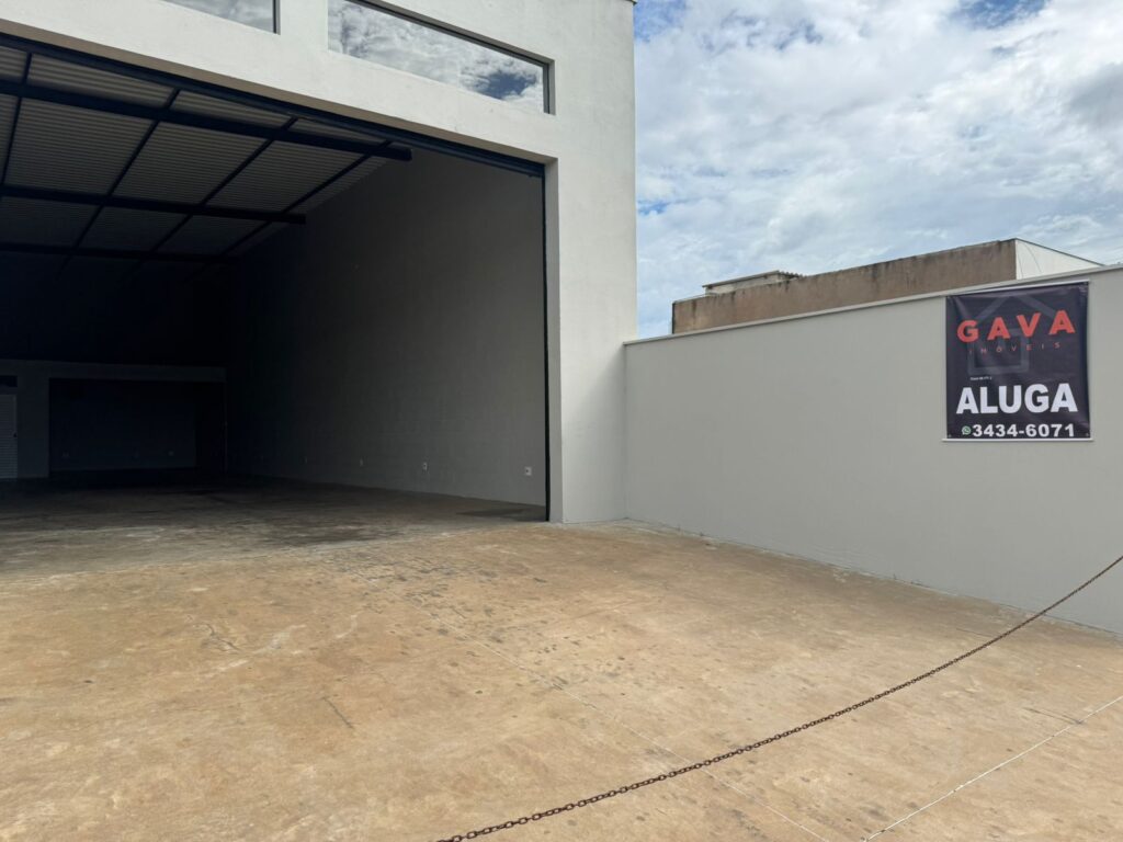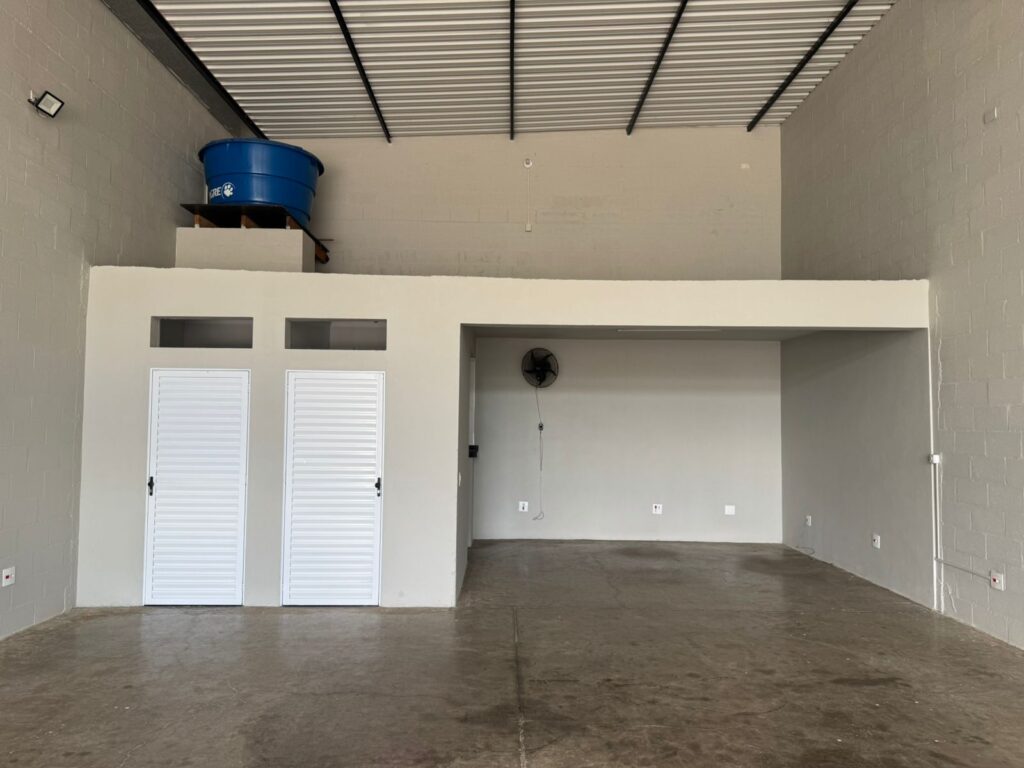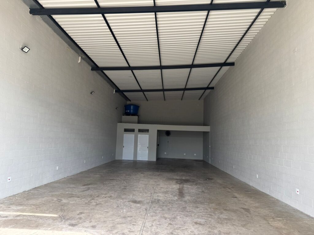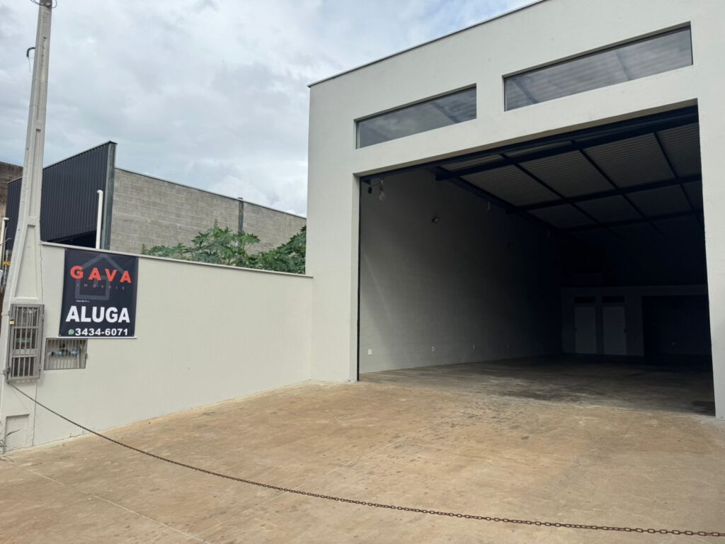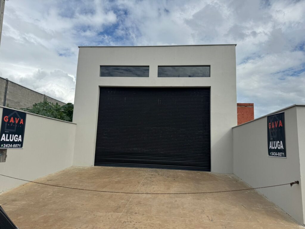 Barracão com recuo para carros, porta automatizada, 2 banheiros e copa. Metragem de 200 m2.